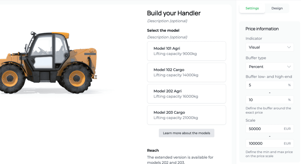 Let’s break down how you can replicate Tesla’s configurator magic in the B2B world. We’ll use a telehandler – a piece of heavy equipment, as our example.