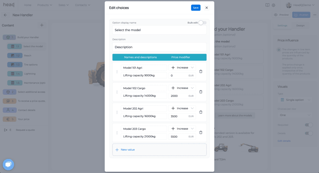 Unlike Tesla, where customers can pay the reservation fee with a credit card and order a car directly, most B2B products aren’t bought this way. Telehandlers, for example, are often sold through detailed quotes, negotiations, and trade-ins. However, with HeadQ’s tool, you could sell a telehandler directly online if it aligns with your company and buyer needs.