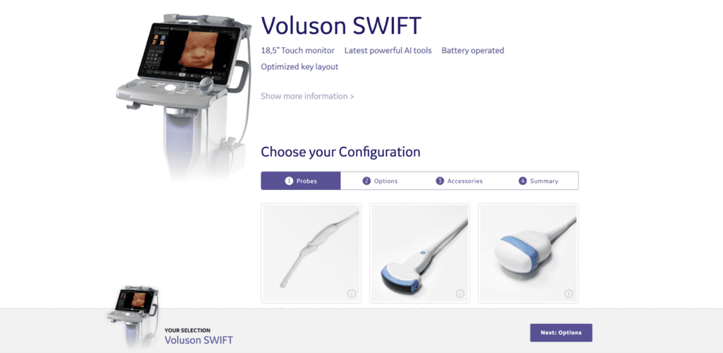 Customers build their own product using the configurator and request a quote. For example, GE healthcare lets buyers configure the ultrasound system they need and request a quote.