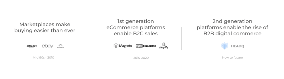 eCommerce took off in early 2000. Amazon, Alibaba, and eBay made buying online a smooth experience and made consumers familiar with buying goods online. These eCommerce giants trailblazed the way for the next generation of digital commerce. Companies such as WooCommerce and Shopify made it possible for B2C companies to sell online. The eCommerce market grew and took over traditional stores by storm.